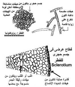 شكل (2) جسم حجري مفكك للفطر ريزوكتونيا (أعلى الشكل) وقطاعات عرضييا يمثل تركيب الجسم الحجري الصلب للفطر سكليروشيوم