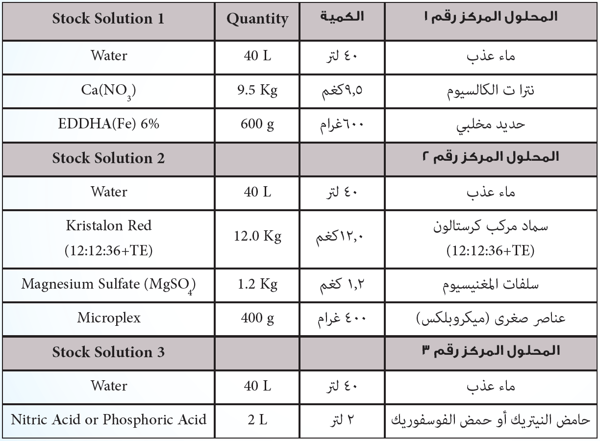 يتم إذابة 9.5 كغم نترات الكالسيوم و 600 غرام من الحديد المخلبي (6%) في 40 لتر ماء.