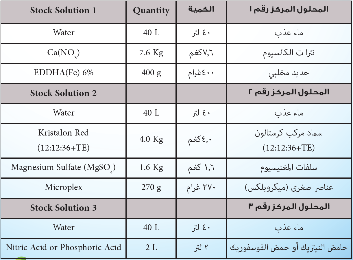يتم إذابة 4 كغم سماد مركب (NPK) مع 1.6 كغم من سلفات المغنيسوم و 270 غرام من سماد العناصر الصغرى (ميكرو بلكس) في 40 لتر ماء.