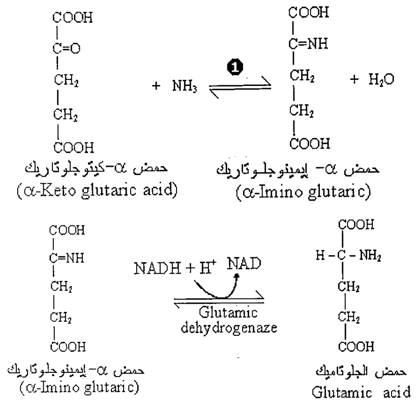 من المحتمل أن التفاعل الاول يحدث تلقائياً Spontaneously ولكن التفاعل الثاني يحدث بمساعدة أنزيم الجلوتاميك ديهيدروجينيز Glutamic dehydrogenase ، ويتطلب وجود النيكوتين أميد ادنين ثنائي النوكليوتيد المختزل (NADH + H+) Reduced nicotinamide adenine – dinucleotide، ونظراً للأهمية الحيوية للجلوتاميك في بناء الأحماض الأمينية الأخرى، ولأن الجزء الأكبر من الجلوتاميك يتكون بهذه الكيفية بواسطة النبات، لذلك فإن التفاعل المذكور يعتبر بالغ الأهمية بالنسبة للأيض النيتروجيني في النبات، ويمكن القول بأنه المنفذ الرئيسي لنظام التحول الغذائي للنتروجين غير العضوي في النبات، وإن الانتشار الواسع لأنزيم جلوتاميك ديهيدروجينز Glutamic dehydrogenase في النبات يؤيد بشدة المقولة السابقة. كما إن عملية الاختزال الاميني لتكوين أحماض أخرى غير الجلوتاميك تعتبر غير ذي أهمية بل محدودة، مثل تكون الاسبارتيك من حمض الأوكسالوأستيك وكذلك حمض الانين من البيروفيك وبالتالي فعملية الاختزال الاميني a-Keto glutaric تعتبر الأهم والأكثر شيوعاً في تشكيل الاحماض الامينية في النباتات.