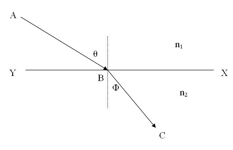 فإذا كان XY يمثل سطحا مستويا يفصل بين وسطين معامل انكسارهما n2, n1 و أن AB يمثل الشعاع الضوئي الساقط و أن BC يمثل الشعاع المنكسر، فان