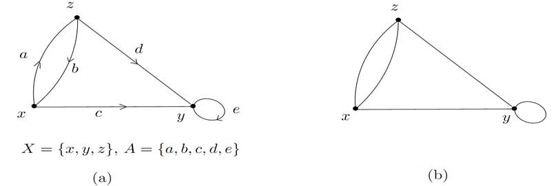 Figure 1. 1 (a) A digraph: the arc a is associated with the ordered pair (x, z), b with the ordered pair (z,x), c with the ordered pair (x, y), d with the ordered pair (z, y),and e with the ordered pair (y, y); (b) the underlying graph