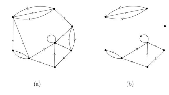 Figure 1.3. (a) A digraph which is not strongly connected; (b) its three strongly connected components (note that one of them is reduced to a vertex)