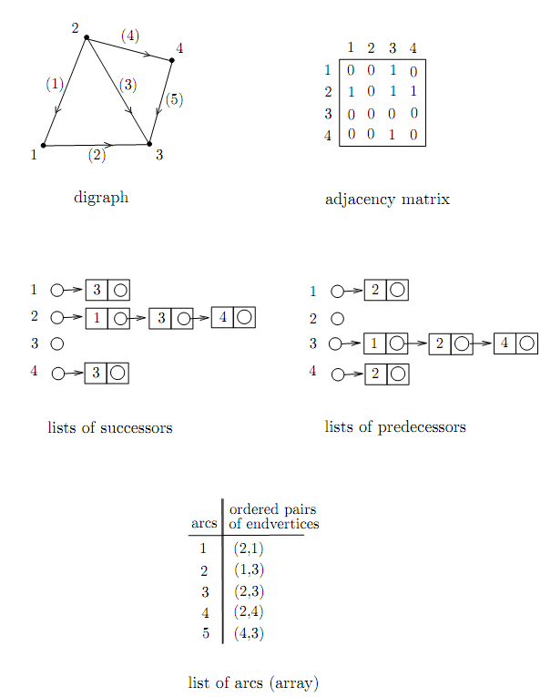 2. The data for the neighborhood of each vertex can be given by lists of successors: each list associated with a vertex contains the successors of that vertex. Classically, it is possible to implement these lists as linked lists. In concrete terms, a table indexed on the vertex type contains for each vertex an access pointer to its list of successors. For some applications the digraph is more naturally represented by lists of predecessors. Each vertex is associated with the list of its predecessors. It is not very hard to go from one to the other, that is from successors’ lists to predecessors’ lists and vice versa (write the corresponding algorithms).