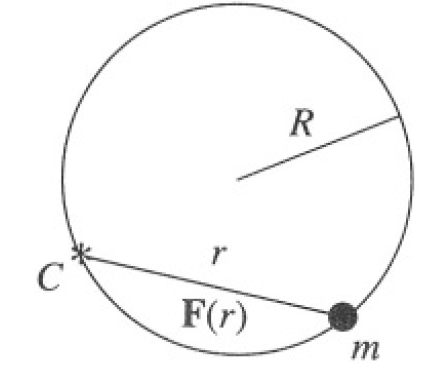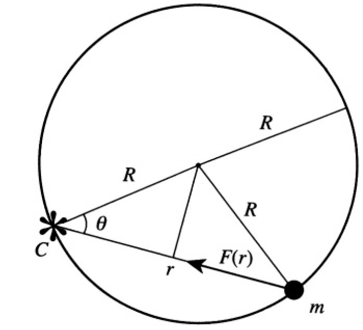 A particle of mass m moves in a circular orbit of radius R under the influence of a central force F(r). The center of force C lies at a point on the circle (see Figure 1.1). What is the force law?