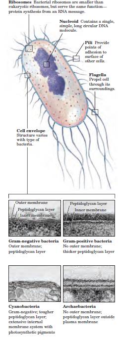 FIGURE 1–1 Common structural features of bacterial cells. Because of differences in the cell envelope structure, some eubacteria (grampositive bacteria) retain Gram’s stain, and others (gram-negative bacteria) do not. E. coli is gram-negative. Cyanobacteria are also eubacteria but are distinguished by their extensive internal membrane system, in which photosynthetic pigments are localized. Although the cell envelopes of archaebacteria and gram-positive eubacteria look similar under the electron microscope, the structures of the membrane lipids and the polysaccharides of the cell envelope are distinctly different in these organisms.