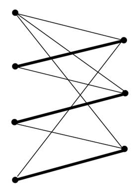 Figure 1.1. By giving a first color to the edges of the maximum matching shown in bold, it will not be possible to have a Δ-coloring of this bipartite graph of maximum degree 3 (because of the degree 3 vertex on the upper left).