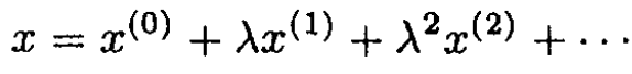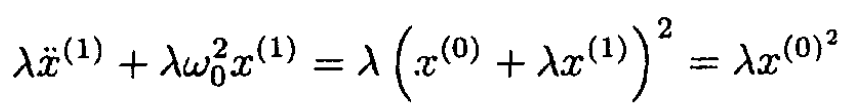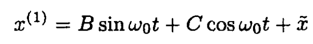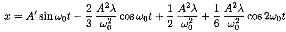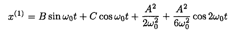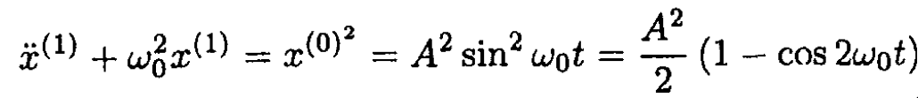 Since we are looking only for the first order corrections, we do not have to consider a frequency shift in the principal frequency ω0. The solution of equation (3) with initial condition x(0) = 0 is x(0) = A sin ω0t. Substituting this into (1) and using (2), we obtain an equation for x(1) (leaving only the terms which are first order in λ).
