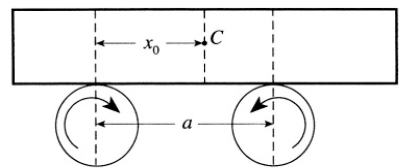 A uniform thin rigid rod of mass M is supported by two rotating rollers whose axes are separated by a fixed distance α. The rod is initially placed at rest asymmetrically, as shown in Figure 1.1a.