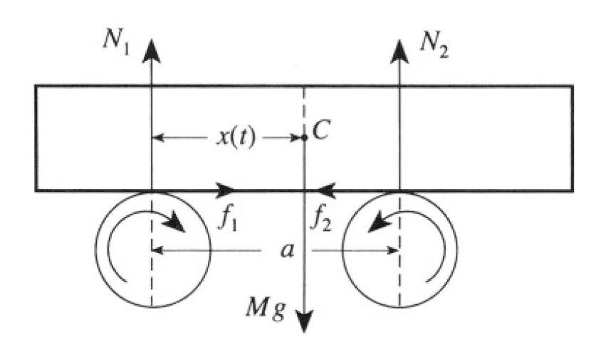 a) Assume that the rollers rotate in opposite directions. The coefficient of kinetic friction between the bar and the rollers is μ. Write the equation of motion of the bar and solve for the displacement x(t) of the center C of the bar from roller 1, assuming x(0) = x0 and