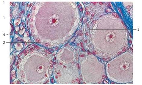 Human and animal cells are de dictated to specialized functions within the organism, and their sizes, shapes and structures vary accordingly. Spinal ganglion cells are mostly pseudo unipolar neurons and can b e spherical, ellipsoid, or pear-shaped, with diameters between 20 and 120 μm. The round cell nuclei, up to 25 μm in size, contain little chromatin 1 . The nuclei always have a clearly visible nucleolus (2–4 μm). Glial cells form a layer around the spinal ganglion cells. Therefore, they are also called satellite cells 2 . The small round or spindle-shape d nuclei of these satellite cells stand out because they are heavily stained. There are delicate connective tissue fibers (endoneurium) and nerve fiber bundles (fascicles) 3 between the ganglion cells. In the upper right of the figure, a wide strand of connective tissue (stained blue) traverses the section .