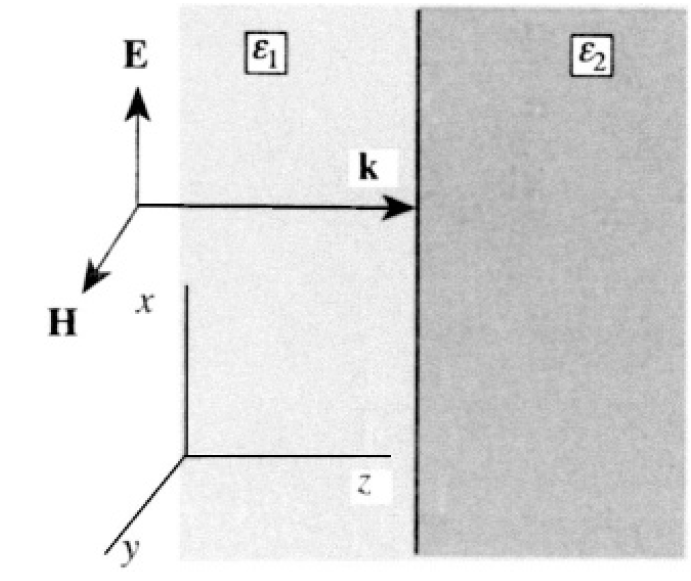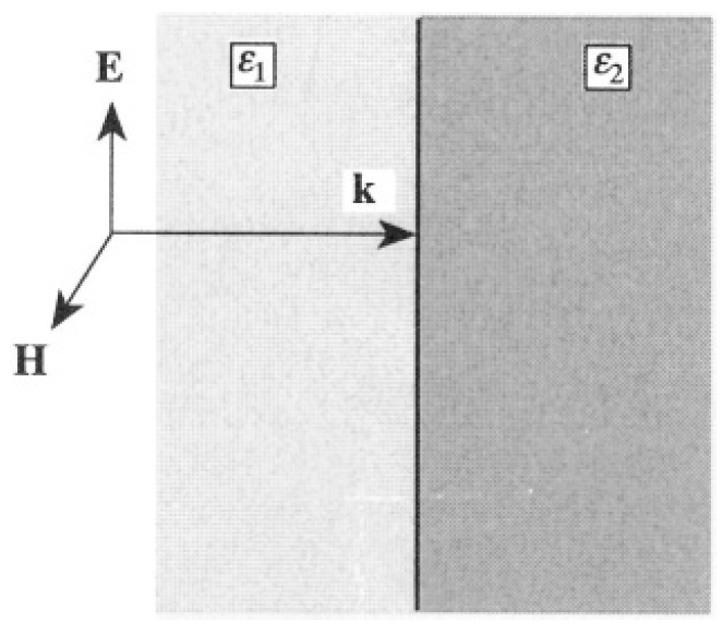 A monochromatic plane wave of frequency ω propagates through a non-permeable (μ = 1) insulating medium with dielectric constant ε1. The wave is normally incident upon an interface with a similar medium with dielectric constant ε2 (see Figure 1.1).