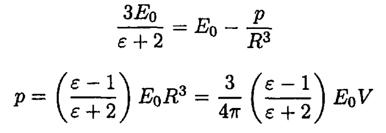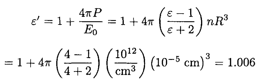 The apparent but wrong answer ε' = 1 + (ε – 1)nV comes about by neglecting the shape of the particles and considering ε' as the average of the dielectric constant of free space, 1, and the dielectric constant of the spheres, ε.