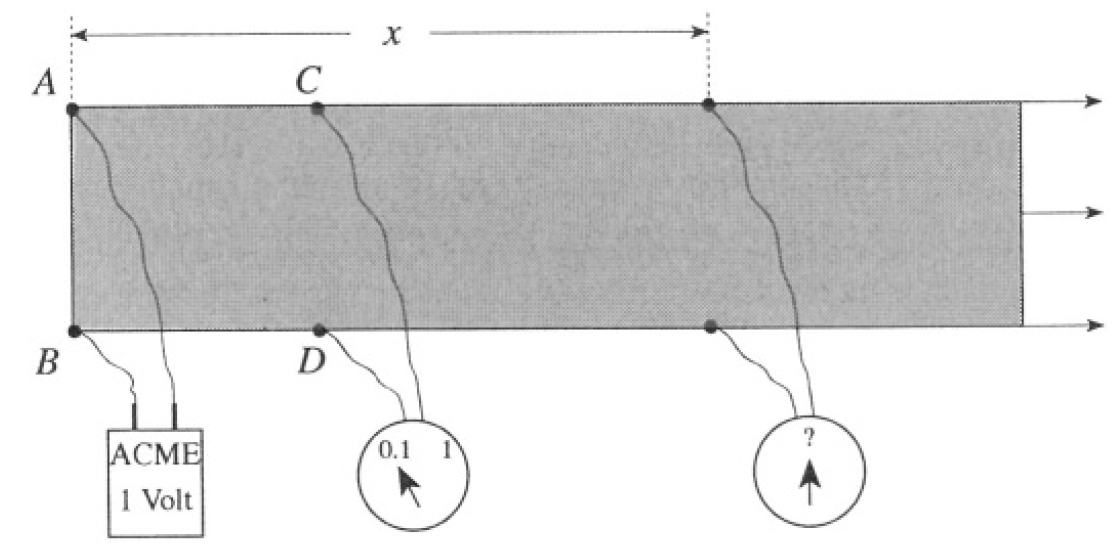 Consider a thin semi-infinite plate of negligible thickness made of an isotropic conductive material. A voltage V0 = 1 V is applied across points A and B of the plate (see Figure 1.1). At a distance d = 1 cm from the end a voltage of 0.1 V is measured between points C and D. Find the voltage difference between two analogous points an arbitrary distance x from the end of the plate.