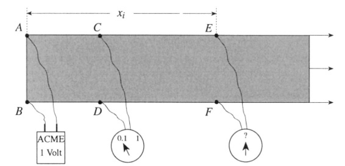 Consider the voltage difference between arbitrary points (E, F) a distance xi from the end (see Figure 1.2). We can write