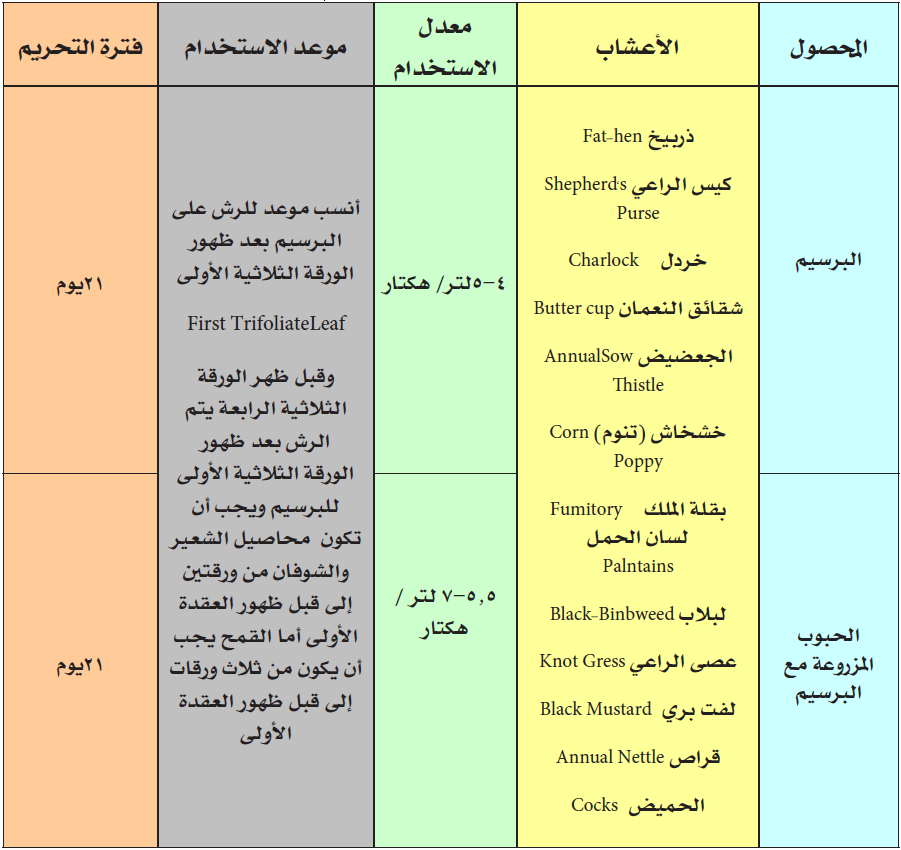 - لا يسمح برعي الماشية أو تقديم العلف المعامل قبل مرور 14 يوم على الرش.