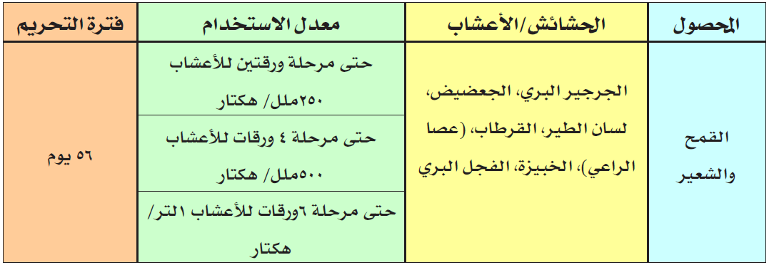 - لا يسمح برعي الماشية في المناطق المعاملة أو تقديم المحصول المعامل لها قبل مرور 21 يوم على الرش.