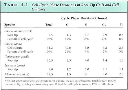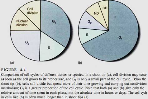 such as some algae, the cell cycle may be as brief as several hours; short cycle times also occur in rapidly growing embryos and roots. On the other hand, cell cycle times of 2 to 3 days or even weeks or months are not unusual in tissues or plants that grow slowly. During winter dormancy, the cell cycle may last from autumn until spring; when dormancy is broken and metabolism accelerates, the cell cycle may last only a few hours. The actual length of time that any cell spends in G1 is similarly variable. Although there are exceptions, in general G1 is the longest part of the cell cycle (Table 4.1). Once a cell undergoes cell cycle arrest, stops dividing, and begins to differentiate and mature, it may enter a state similar to G1 and remain in it for the rest of its life.