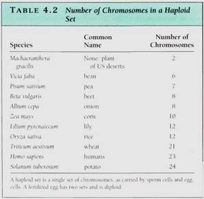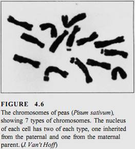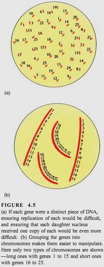 Obviously, if each individual gene floated around the cell or nucleus as an independent piece of DNA, then during division, it would be extraordinarily difficult to find each of those 200,000 genes (100,000 originals and 100,000 copies) and make certain that each daughter cell received one of each (Fig. 4.5). This is not a problem, however, because all genes are attached to other genes by short pieces of linking DNA. Thousands of genes can be attached together in a linear sequence; the whole structure is a chromosome (Fig. 4.6). Although it might seem reasonable for all genes to link together in a single chromosome, such a long chromosome would probably become hopelessly tangled. Only a low plants have as few as two chromosomes for their genome; most have between 5 and 30 chromosomes (Table 4.2).