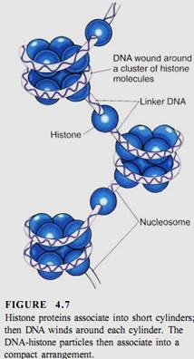 Even with 20 different chromosomes, an organism with 100,000 genes would have an average of 5000 genes on each chromosome, resulting in long pieces of DNA that might break if unprotected. In onion, the DNA in each nucleus is 10.5 meters long when all DNA molecules are measured; in lilies it is 21.8 meters long. In eukaryotes a special class of proteins called histones complexes with the DNA and gives it both protection and structure (Fig. 4.7). Chromosomes also have another structural feature, the centromere, which is usually located near the center of the chromosome (Fig. 4.8).