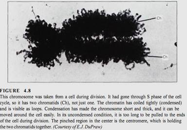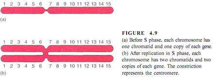 During the S phase, linking pieces of DNA as well as genes are replicated and new histone molecules complex with the new DNA. Thus entire chromosomes, not just DNA, are replicated (Fig. 4.9). Once replication is finished, the duplicate DNA molecules remain attached at the centromere. Although it would be justifiable to call this a "double chromo-some" or a "pair of chromosomes," it is also called a chromosome. Now that we know how a chromosome changes during S phase, we call each half of the doubled chromosome a chromatid. After S phase each chromosome has two identical chromatids; before S phase each chromosome has just one chromatid. It is important to remember that a chromosome after S phase is twice as large as it was before S phase.