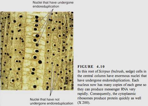 Although many cells stop in Gi when they cease dividing and begin to mature, most plant cells enter S phase and replicate their DNA before they begin to differentiate. This may involve just a single cycle of DNA replication, resulting in a nucleus that is twice as large as would be expected, or it may continue for many rounds of DNA synthesis and the nucleus becomes gigantic (Fig. 4.10). This process is endoreduplication, estimated to occur in 80% of all maturing plant cells (Table 4.3). The resulting nucleus has many copies of each gene-as many as 8192 copies in some cells of kidney beans (Phaseolus vulgaris). Endoreduplication occurs most often in hairs, glandular cells, and other cells that must have an extremely rapid, intense metabolism. The normal complement of two copies of each gene does not seem to make messenger RNA rapidly enough for such active cells. Such cells are also rich in ribosomes and produce large amounts of protein.