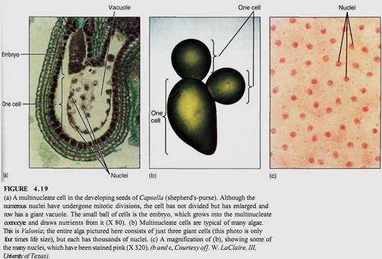 Cytokinesis and karyokinesis are often so closely associated that we tend to think of them as two aspects of one process. In numerous tissues, however, karyokinesis occurs without cytokinesis, and multinucleate cells are formed. The nutritive tissue of many seeds goes through a phase in which its cells are multinucleate (Fig. 4.19), and in many algae all the cells are like this. If the cell becomes very large and has hundreds or thousands of nuclei, it is called a coenocyte.