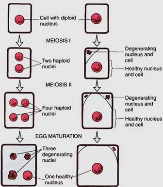 FIGURE 4.20: In animals and some plants, the meiosis that is part of egg production produces only one large haploid cell. (a) In some species, meiosis results in four haploid nuclei; no cytokinesis occurs and all four nuclei are temporarily in one cell until degeneration eliminates three of them. (b) In other species, after meiosis I occurs, cytokinesis places one nucleus in a small cell, and both nucleus and cell degenerate before they can undergo meiosis II. The nucleus of the larger cell does undergo meiosis II, and again one daughter nucleus is placed in a small cell that degenerates. Only three nuclei are ever formed, and only one survives.