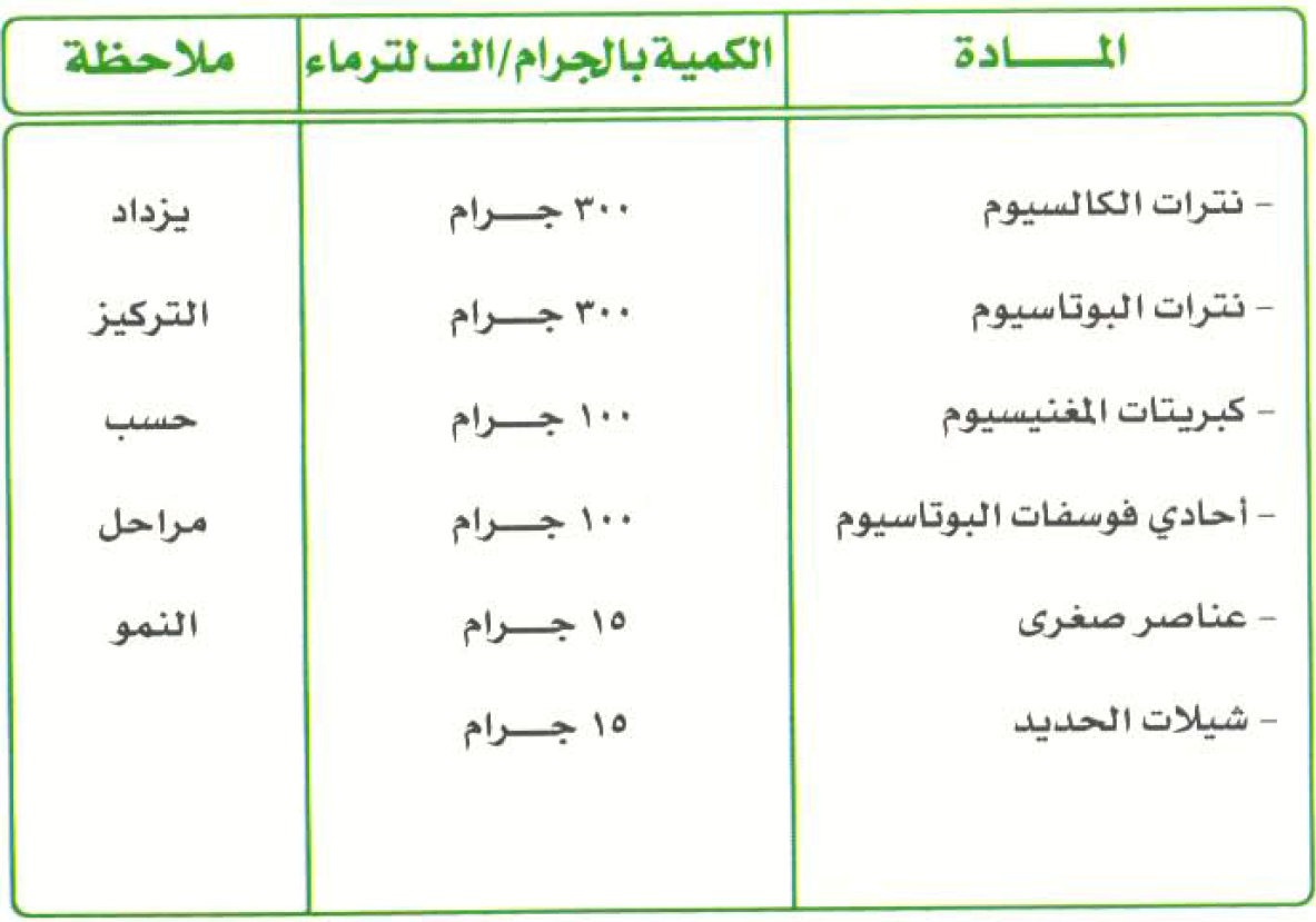 ملحوظة: تختلف نسبة تركيز المحلول الغذائي حسب حالة النبات اثناء الموسم.