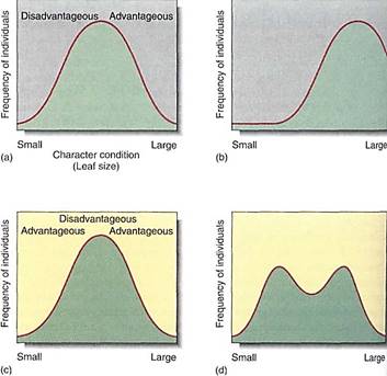 FIGURE 1: (a) and (b) In phyletic speciation, all of a species gradually changes because one particular aspect of a character is advantageous for all individuals. Here, all leaves become larger; perhaps the climate is becoming more humid or herbivorous insects are less of a problem. (c) and (d) In this scenario of divergent evolution, both extremes of the condition are more advantageous than intermediate values; the climate may become drier in some areas, favoring the smaller leaves, but moister in other areas, favoring plants with larger leaves.