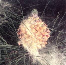 FIGURE 2:Strong winds can blow pollen great distances, resulting in gene flow between widely separated points. Much of the pollen actually settles near the parent plant, but large numbers of pollen grains may travel a long distance and then successfully fertilize eggs. The new sporophytes pass on the pollen's genes to their progeny. Pinus canariensis. (Robert and Linda Mitchell).