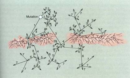 FIGURE 3:Gene flow. This range is almost divided in two by a series of mountains over which pollen and seeds cannot travel; this slows down gene flow and homogenization of the population. The numbers indicate the generation in which the allele flows: 1—gene flow in the first generation; 2—gene flow from plants that grew from seeds produced by the gene flow of the first generation, and so on. Here, three generations were necessary for the new allele to become distributed to the lower side of the mountains, seven generations to become widespread throughout the range. In a species of annual plants, each generation is 1 year long; for biennials, a generation is 2 years long and gene flow is slower. In trees that do not produce their first flowers, pollen, or seeds until they are many years old, gene flow can be very slow.