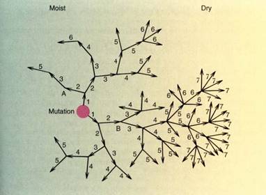 FIGURE 4:A mutation has produced an allele highly adaptive in dry parts of the range but neutral or deleterious in moist parts. Because it originated in a less-than-optimal environment, in generation 1 only two offspring survive. In generation 2, each of these produces two more that survive, one in a moister habitat (A), one in a drier region (B). The allele is deleterious at A, and only a single progeny survives in generation 3; at B, two survive, both in drier habitats, and in generation 4 each produces three surviving progeny. As the alleles flow, by chance, into regions that are more optimal (drier), reproductive success is greater and the allele frequency increases. As they flow, by chance, into unsuitable habitats, reproductive success is low and the allele never becomes abundant.