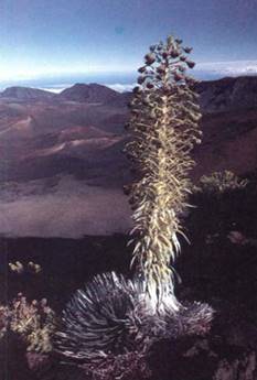 FIGURE 5:One of the pioneer plants that arrived and colonized the Hawaiian Islands was a composite, related to daisies. Because of the low levels of competition and because so few individuals existed initially, each mutation became a significant part of the gene pool even while only one or a few copies existed, so genetic drift was rapid. Argyroxyphium, silver swords, grow only in Haleakala National Park in Hawaii. Goats ate them almost to extinction before the park was established. (Stephen ]. Krasemann/© Peter Arnold, Inc.)