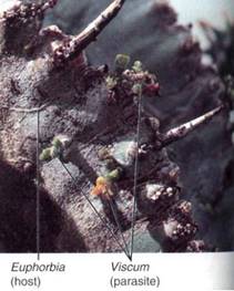FIGURE 7:Cacti and euphorbias have undergone extensive convergent evolution, and each is parasitized by distinct types of mistletoe that have also undergone convergent evolution. Viscum minimum infects Euphorbia lactea; compare it with Tristerix aphyllus, which infects the cactus Trichocereus chilensis. The selective advantages associated with T. aphyllus and its succulent, desert-adapted host were discussed in Box 5.1. Those same considerations are also valid for Viscum minimum and Euphorbia lactea.