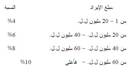 سعر الضريبة: تطبق الشريحة الضريبية التالية على صافي الإيرادات الحقيقية أو المقدرة، من جميع العقارات التي يملكها في المحافظة الواحدة، بعد تنزيل الأعباء التي يستفيد منها: