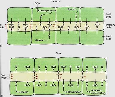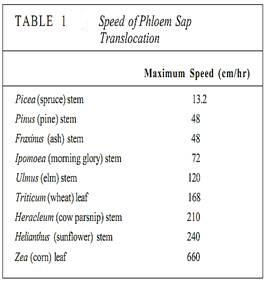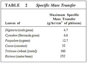 In sources, phloem loading occurs along numerous vascular bundles such as the fine veins in leaves, the network of bundles in tubers and corms, and the inner bark in storage roots and stems. With this massive loading, pressure builds quickly and a large volume of material flows from the source. The rate of transport can be high; up to 660 cm/hr has been measured in leaves of corn (Table 1). The actual amount of sugars and other nutrients (excluding water) transported by phloem per hour is called the mass transfer. Vascular bundles vary not only in the speed at which their phloem translocates but also in the amount of phloem present. The number of bundles leaving a source is also important. To make comparisons easier, mass transfer can be divided by the cross-sectional area of phloem to obtain the specific mass transfer (Table 2).