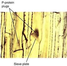 Because phloem sap is under pressure, the danger exists of uncontrolled "bleeding" if the phloem is cut. Vascular bundles are broken open frequently, especially by chewing insects and larger animals. Two mechanisms seal broken sieve elements. The first is P-pro- tein (P for phloem), found as a fine network adjacent to the plasma membrane inner surface of uninjured sieve elements. When phloem is ruptured, the phloem sap initially surges toward the break; this rapid movement sweeps the P-protein into the cell center, where it becomes a tangled mass. When it is carried to a sieve area or sieve plate, the P-protein mass is too large to pass through and forms a P-protein plug (Fig. 2).