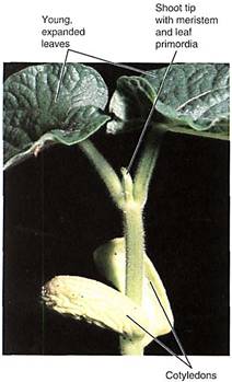 FIGURE 3:This bean contains two prominent sources, the cotyledons, which are supplying sugars, amino acids, and minerals to the rest of the seedling. The shoot tip with its meristem and leaf primordia are sinks, as are the roots. The first two leaves are expanded and are probably sources now, but they were sinks while they were developing.