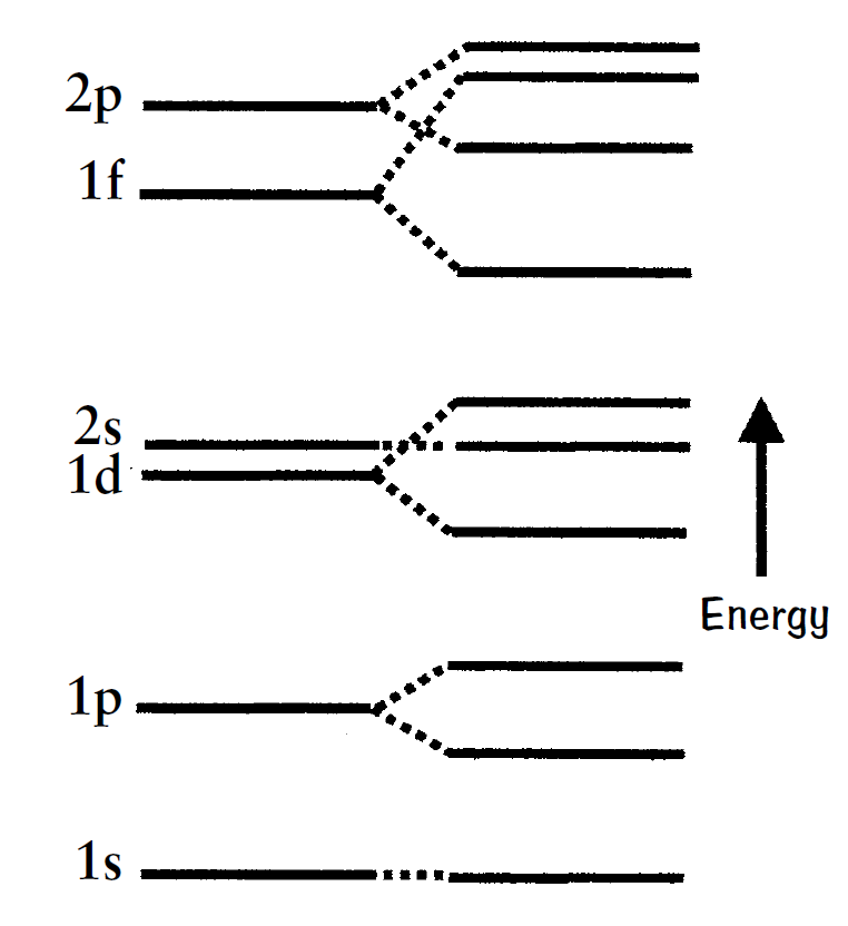 states such as n = 1, with l = 0, 1, 2, 3, etc., are possible in the shell model, the predicted energy levels did not fit the data. In fact, the actual energy levels were all scrambled compared to the shell-model theoretical predictions. Why?