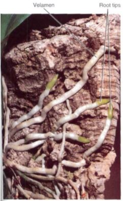 FIGURE 3: Aerial roots of orchids, which grow along the surface of tree bark, are covered by a white velamen that helps retain the water absorbed by the green root tip.
