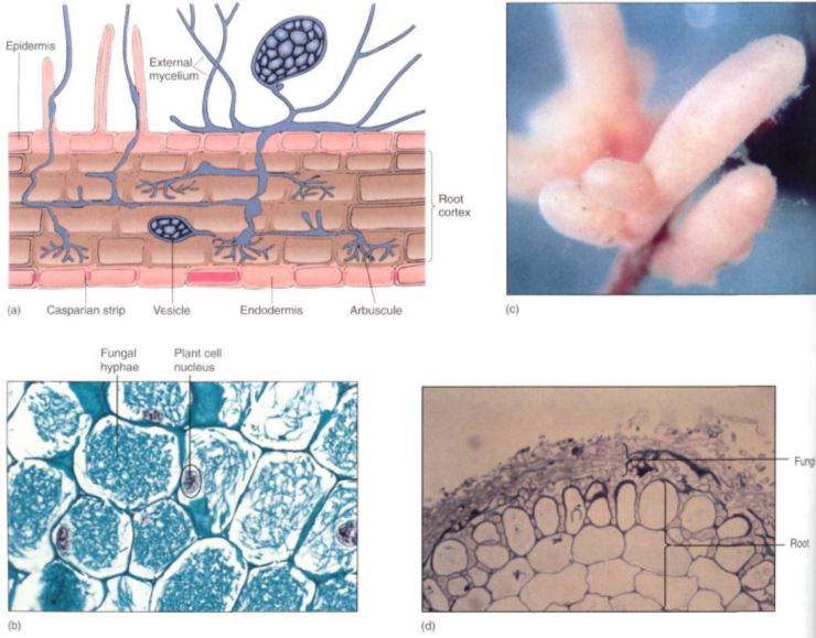 FIGURE 5: (a) Diagram of endomycorrhizae showing hyphae penetrating the root cortex and forming arbuscules and vesicles. (b) Root cells filled with fungal hyphae in the form of arbuscules. You can tell that this is a symbiotic fungus rather than a pathogenic one because the plant cells are healthy, with large normal nuclei (X 220). (c) Roots of beech encased in ectomycorrhizae. The' presence of the fungus stimulates the roots to be short and broad, (d) Transverse section of an ectomycorrhizal root showing that the fungal filaments are restricted to just the outermost part of the root; they do not penetrate the cortex.