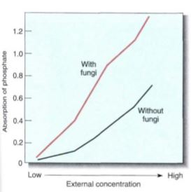 FIGURE 6: The ability of barley roots to absorb phosphorus from solutions of different concentrations is shown on this graph. Both sterilized roots (fungi killed) and natural roots (fungi still alive) absorb phosphorus more rapidly from the solutions with the high concentrations of phosphorus, but at every concentration the roots with mycorrhizal fungi absorb much more phosphorus than the sterile roots.