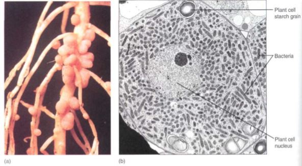 FIGURE 7: (a) The nodules on these alfalfa roots contain bacteria capable of absorbing atmospheric nitrogen and converting it to ammonia, which the plant can use to make amino acids. (Hugh Spencer/Photo Researchers, Inc.) (b) Bacteria in an infected root nodule cell of cowpea, Vigna unguiculata (X 5900). (Courtesy of E. H. Newcomb, University ofWisconsin, Madison)