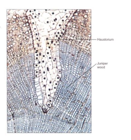 FIGURE 8: Transverse section of a branch of juniper being attacked by the haustorium (modified root) of a mistletoe (Phoradendron). The wood of the host juniper has been stained blue, the bark is tan. The haustorium is able to draw water and nutrients from the host vascular tissue.