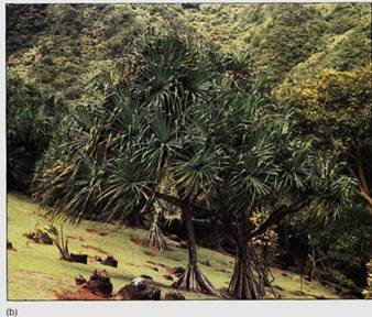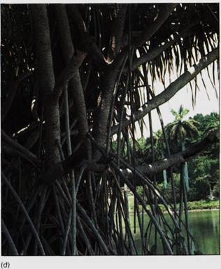 FIGURE 1: (a) Many monocots like this palm (Ptychosperma) produce adventitious roots near the base of the stem These provide both extra absorptive capacity and extra stability. (b and c) Screwpine is able to produce extremely long adventitious pep roots that not only stabilize the large, heavy tank but also bring water and minerals into the stem (d) In older plants of screwpine, even the branches produce adventitious roots. This water and mineral supply to the branches bypasses the trunk, where the vascular bundles are already conducing at full capacity.