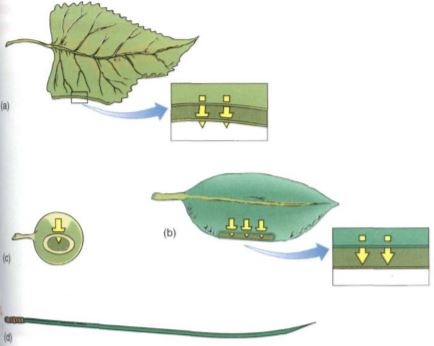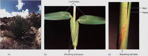 FIGURE 4 :(a) Long, narrow leaves are common in many monocots of intensely sunny areas. Shading is no problem, although the leaf bases probably do not photosynthesize at maximum efficiency. (b) These are the leaves of St. Augustine grass; the blades project horizontally and are attached to the stem by sheathing leaf bases. (c) In cattails, the sheathing leaf base can be half a meter long and provide firm but flexible attachment to the stem.