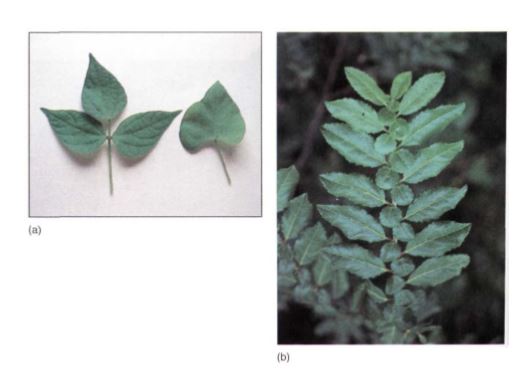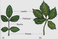 FIGURE 7: Leaflets of compound leaves have the same structure and metabolism as simple leaves. In pinnately compound leaves (rose, a) the petiolules of the leaflets are attached to the rachis, but in palmately compound leaves (Virginia creeper, b) they attach to the end of the petiole. In either type, any leaflet can be damaged or can abscise without affecting the remainder of the leaf.