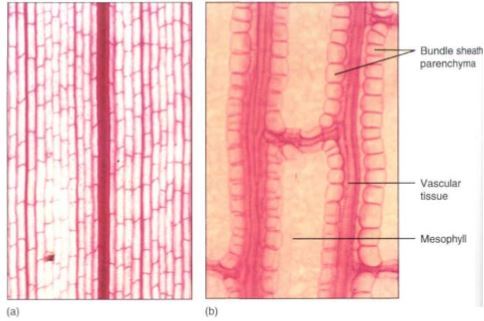 FIGURE 14: (a) Leaf clearing of corn (Zea), a monocot, with several sizes of longitudinal, parallel veins. If a longitudinal vein is broken by insect damage or any other problem, conduction can detour around the site by means of the fine transverse veins (X 50). (b) Higher magnification showing the parenchyma cells that surround the leaf bundles in corn (X 250).