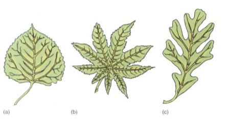 FIGURE 6: Simple leaves have numerous shapes, some so deeply lobed as to be almost compound. Poplar (a) and oak (c) have one dominant midrib from which secondary vascular bundles extend. In the castor bean (b), the petiolar bundles immediately diverge into several main veins.